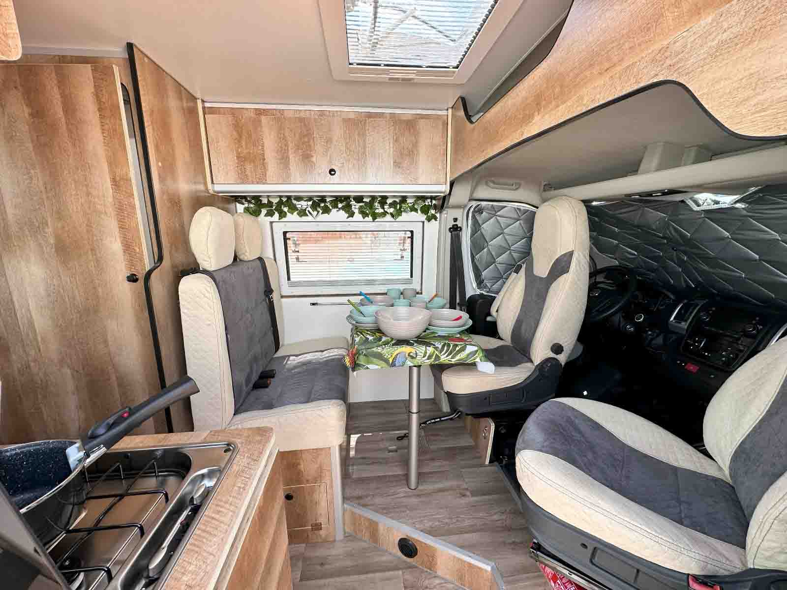 En nuestras furgonetas camper encontrarás todo lo necesario para disfrutar de tu viaje. Baño completo, agua caliente, calefacción estacionaria, claraboyas con ventilador, etc.